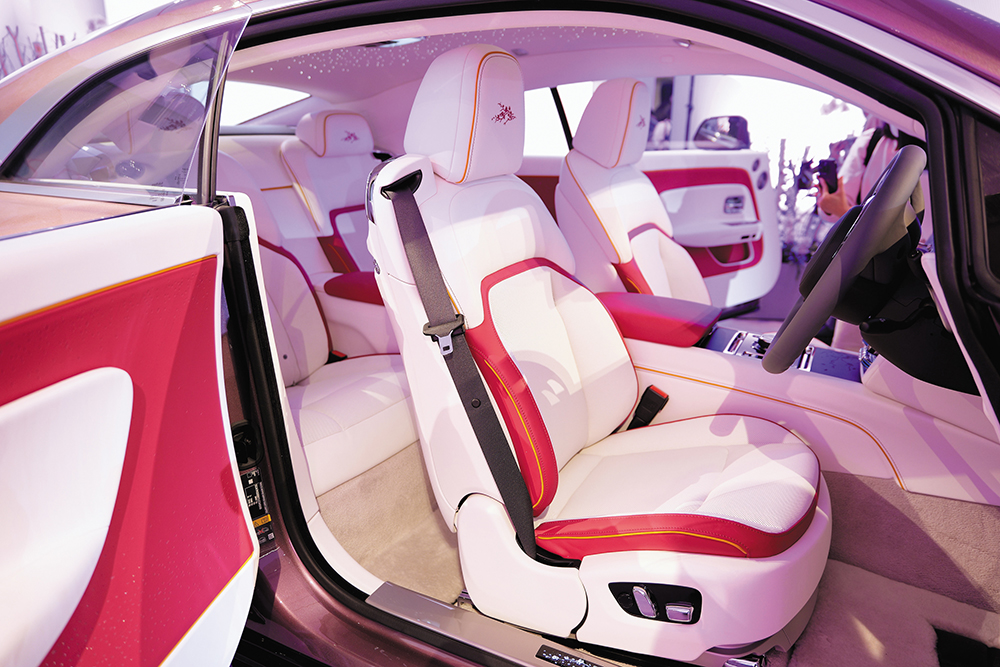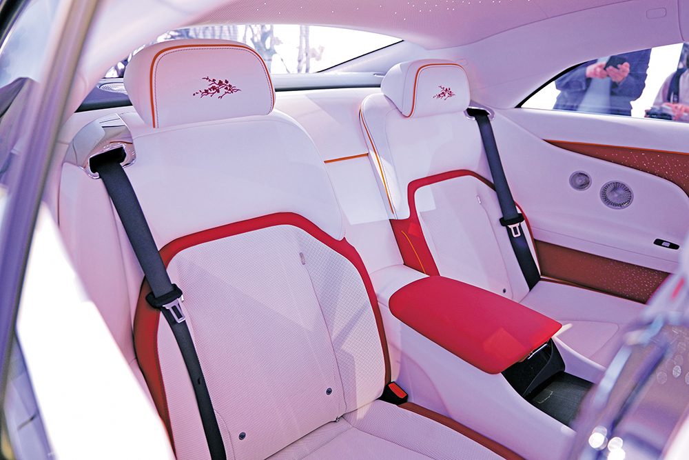 車廂以Grace White白色及Peony Pink紅色皮革配搭,襯以Forge Yellow綑邊和縫線,座椅頭枕也有櫻花刺繡,還有特別版發光門檻銘牌。錶板Blackwood黑木飾片以鐳射刻上春櫻盛開的圖案。其餘像Starlight星光天花板及門板等,也是標準項目。
