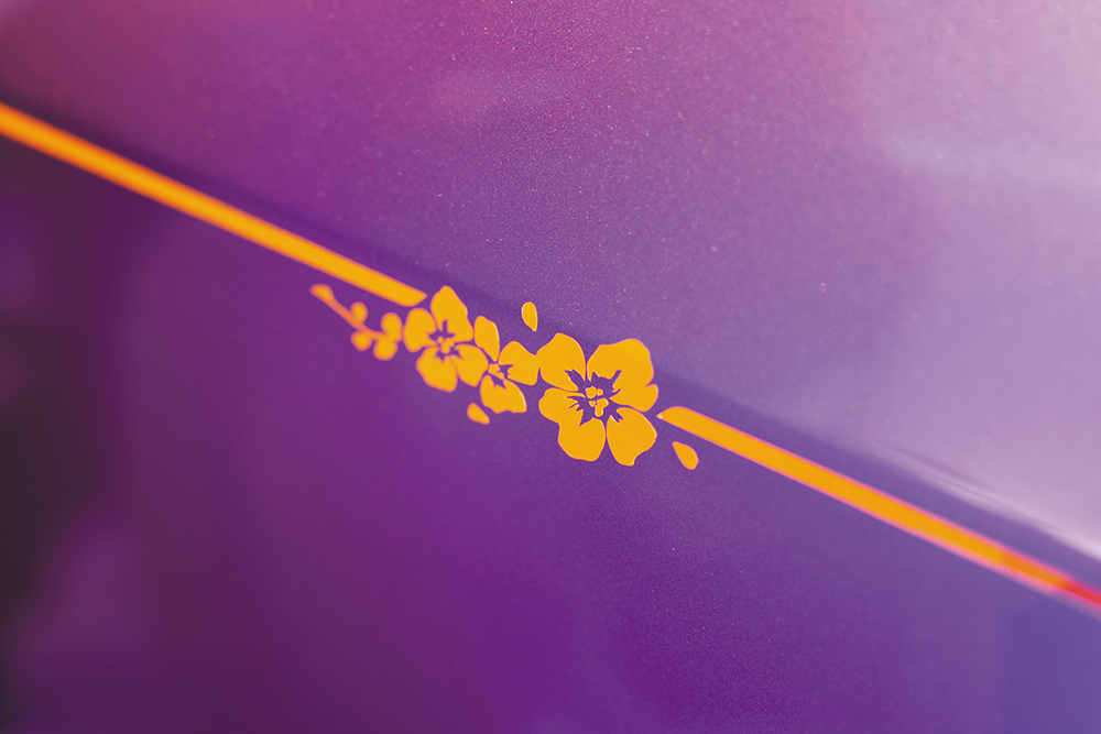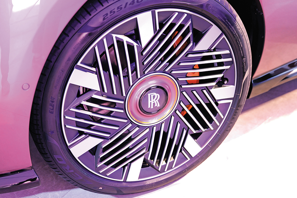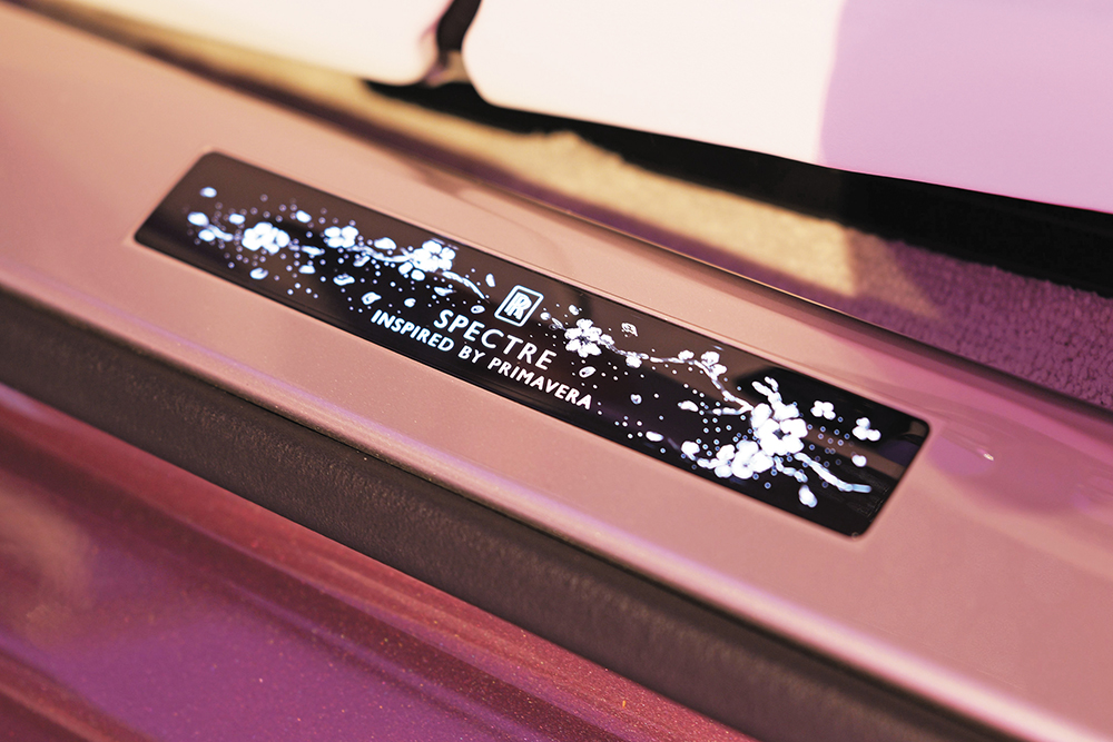 Spectre Inspired by Primavera機械規格跟標準版Spectre無異,只是加入大量專屬Bespoke配置,例如Blossom版配上名為Velvet Orchid Metallic銀底粉紫色車漆,配襯車身Forge Yellow黃色Coachline手繪線及櫻花圖案,23吋輪圈及煞車鉗也有相同黃色配飾。