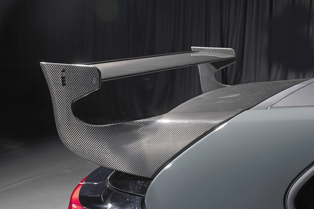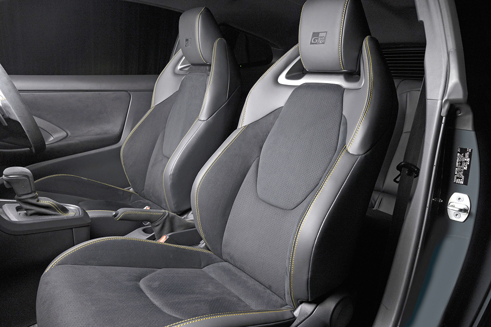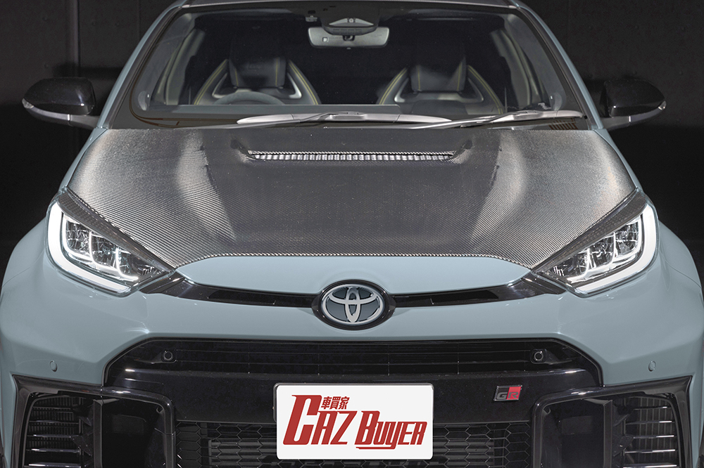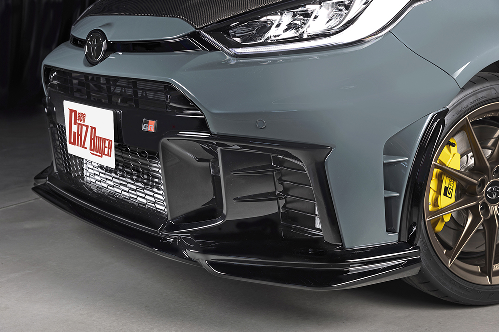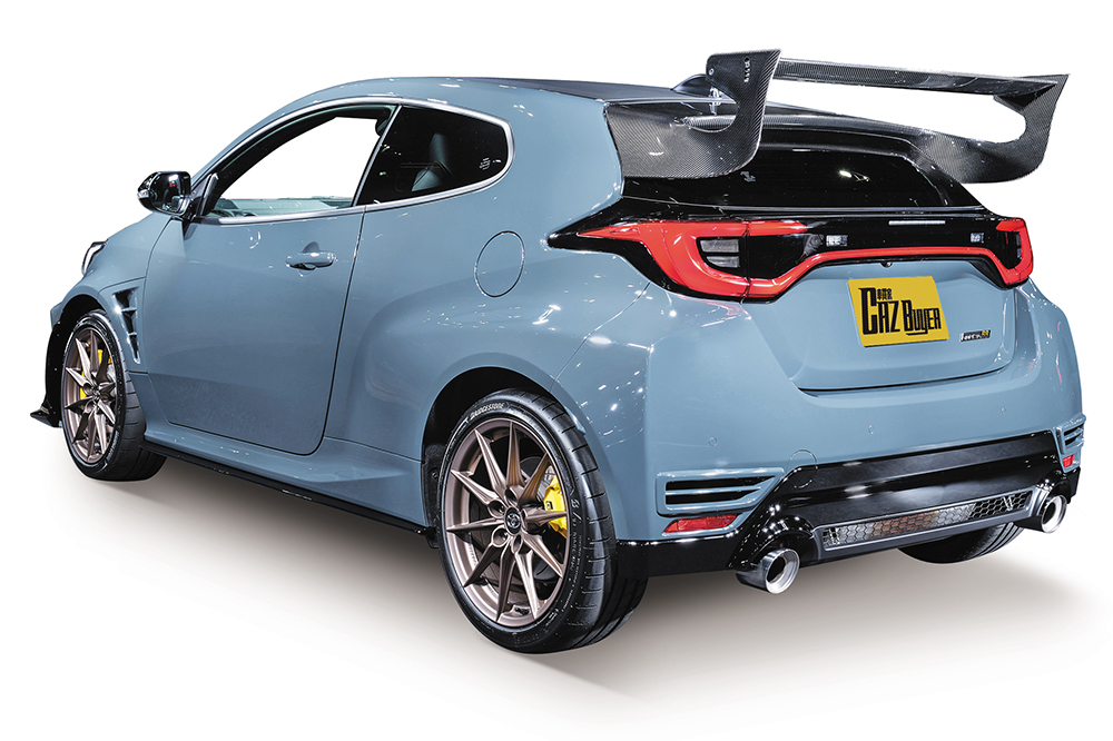 GR Yaris MORIZO RR造型更具競賽風味,全套空氣動力套件,包括前後擾流器、兩側裙邊、碳纖頭冚與碳纖大尾翼,皆參考在紐布靈24小時耐力賽的數據開發。"Gravel Khaki" 灰藍色車身是豐田章男喜愛色澤,18吋多幅式輪圈與高性能制動卡鉗分別以銅與黃色作配。車廂方面,三幅式跑車軚環改為麂皮設計,同時為了提升競賽操控效率,軚環直徑也略為縮小。