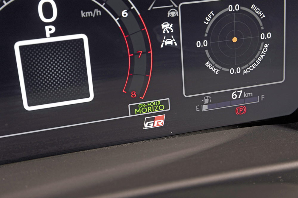 頭枕繡上「GR」字樣的一體化跑車桶座,跟軚環及麂皮波棍同樣加入黃飾線點綴,而表板位置也設有「MORIZO RR」的專屬序號銘牌。值得一提,TGR還為特別版車型開發了一個專屬「MORIZO」四驅模式,以取代原有的「GRAVEL」碎石模式,其前後軸的扭力分配為50:50,結合作出針對性調校的懸掛及EPS電動力輔助轉向系統,藉以全面提升攻彎能耐。