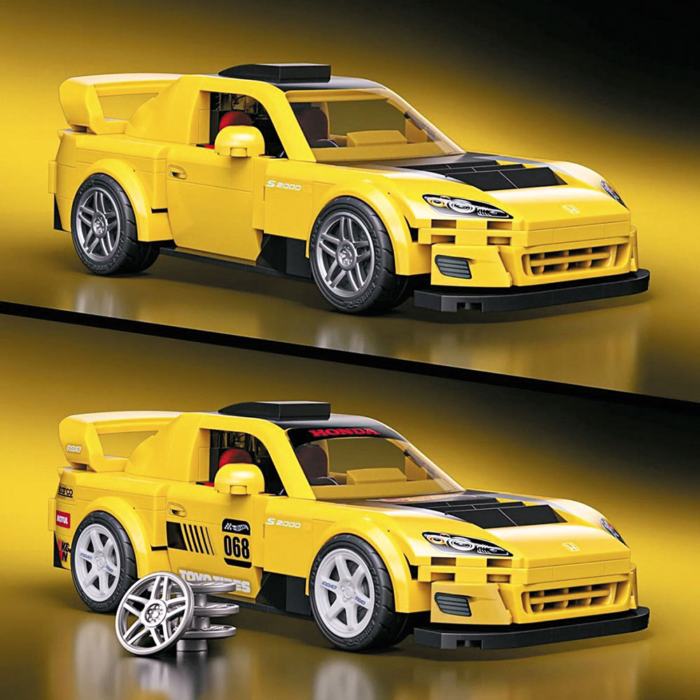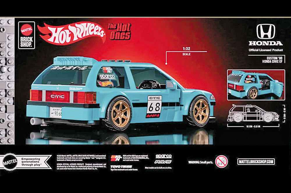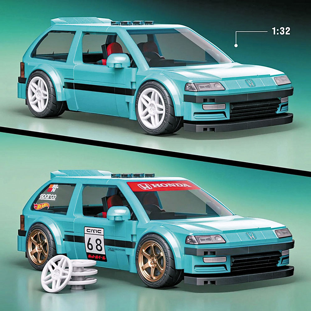 另一邊廂,玩具巨頭Mattel旗下Brick Shop與Hot Wheels聯手,推出兩款經典JDM車型,分別是Honda Civic EF及S2000,賣點是附有2套呔鈴可更換,致敬當年改裝風潮。兩款Honda經典JDM模型車,分別是Custom 90 Honda Civic EF及07 Honda S2000,同屬1:32比例,前者由248件積木砌成,外形重現上世紀80年代後期經典掀背造型,檔風玻璃、前後燈、車門、尾翼等細節有齊,但未至於太精緻,反而超闊拋沙板、「low」低車身及經典TE37風格輪圈就真的似模似樣,除了TE37輪圈,包裝另有一套輪圈可自行更換。