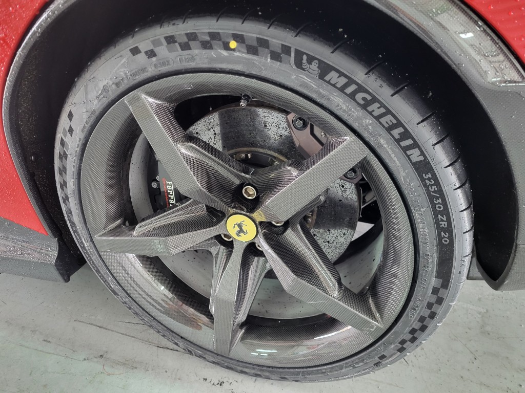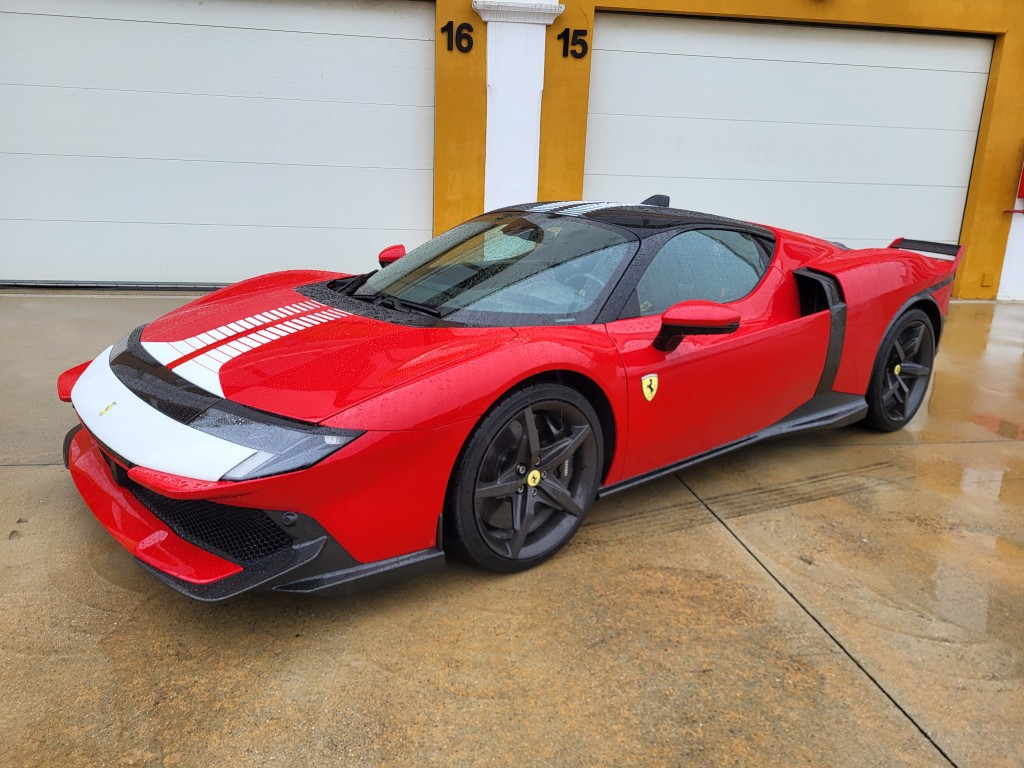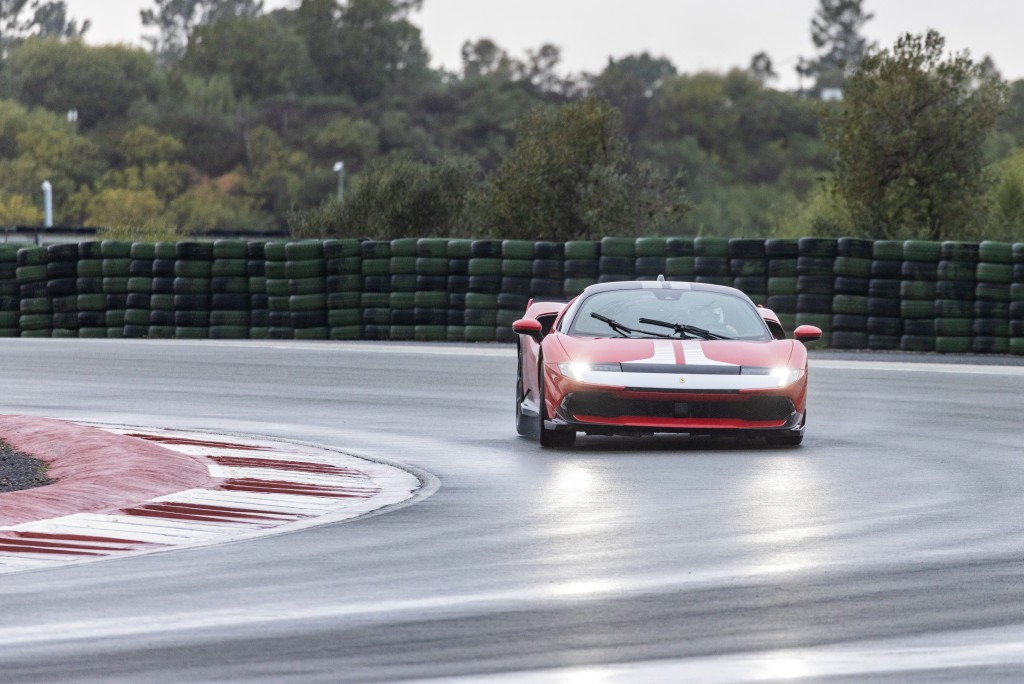 下午賽道試駕環節改用紅色拉花Assetto Fiorano加強版,車子配有全套擾流包圍及車花,泵把頭鏟更大,兩端尾翼呈雙層設計(像FXX K及296 Specale),氣流下壓力多約20%。內外換上輕量化碳纖維件、塑料尾窗等,懸掛引用賽車化Multimatic吸震筒及輕量鈦金屬彈簧,車身乾量減輕30kg至1,540kg,還可選配碳纖維輪圈及Michelin Cup 2或Cup 2R車胎。