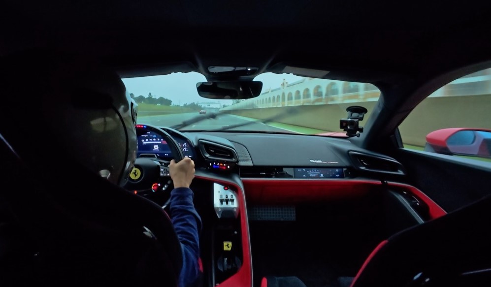今次試車分兩部份,早上先跑約155km公路及山路,下午再到Monteblanco賽道試駕另Assetto Fiorano版本。比較掃興是整天試車下着大雨,路面非常濕滑,唯有先用WET模式。849 Testarossa駕駛感跟上代SF90首個最明顯分別,是轉向操控更輕巧和精準,車頭在入彎時沒有了以往的重量貫性,主控式懸掛Magneride吸震筒進一步減少車身俯仰及傾側度,而且前輪有更充實路面回饋和安穩感覺。